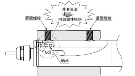 如上圖右1所示直接安裝螺絲時(shí),會(huì)使主軸外套變形造成旋轉(zhuǎn)不良或發(fā)熱的原因。如下圖。