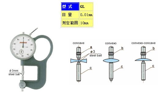 ② 鏡片厚薄表GL型:GL厚薄表可以測(cè)量凹形,凸形和凹凸型鏡片的厚度,改換測(cè)頭和測(cè)砧還可測(cè)量其他類型鏡片的厚度。