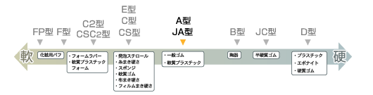 上圖所示為橡膠硬度計(jì)的種類圖, 根據(jù)試樣的種類設(shè)計(jì)不同的硬度計(jì). 符合 JIS K 6253標(biāo)準(zhǔn)的A型橡膠硬度計(jì)是最普遍最常用的一款.但是通常情況下,測(cè)量值在10點(diǎn)~90點(diǎn)之間,使用A型硬度計(jì),A90點(diǎn)以上時(shí)使用D型硬度計(jì)(硬質(zhì)材料使用),A20點(diǎn)以下時(shí)使用C型或E型硬度計(jì)(軟質(zhì)材料使用)。就是說,根據(jù)試料的種類選擇合適的機(jī)型最重要