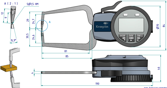 • 德國kroeplin數顯外卡規(guī)C220,測量范圍0-20mm,最小讀數:0.01mm,喉深長度:85mm.