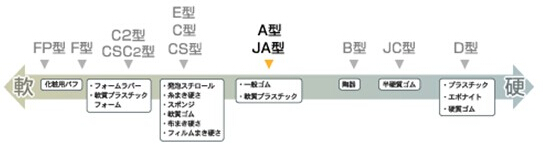 上圖所示為橡膠硬度計的種類圖, 根據(jù)試樣的種類設計不同的硬度計. 符合 JIS K 6253標準的A型橡膠硬度計是最普遍最常用的一款.但是通常情況下,測量值在10點~90點之間,使用A型硬度計,A90點以上時使用D型硬度計(硬質材料使用),A20點以下時使用C型或E型硬度計(軟質材料使用)。就是說,根據(jù)試料的種類選擇合適的機型最重要。