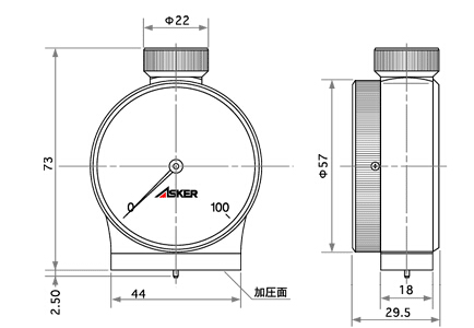 日本ASKER邵氏硬度計A型,是比較常用的橡膠硬度計型號,適用于一般橡膠硬度測量,shore A(20-90度),押針高度2.5mm,押針形狀錐形,端面φ0.79mm,加壓面形狀44*18長方形。